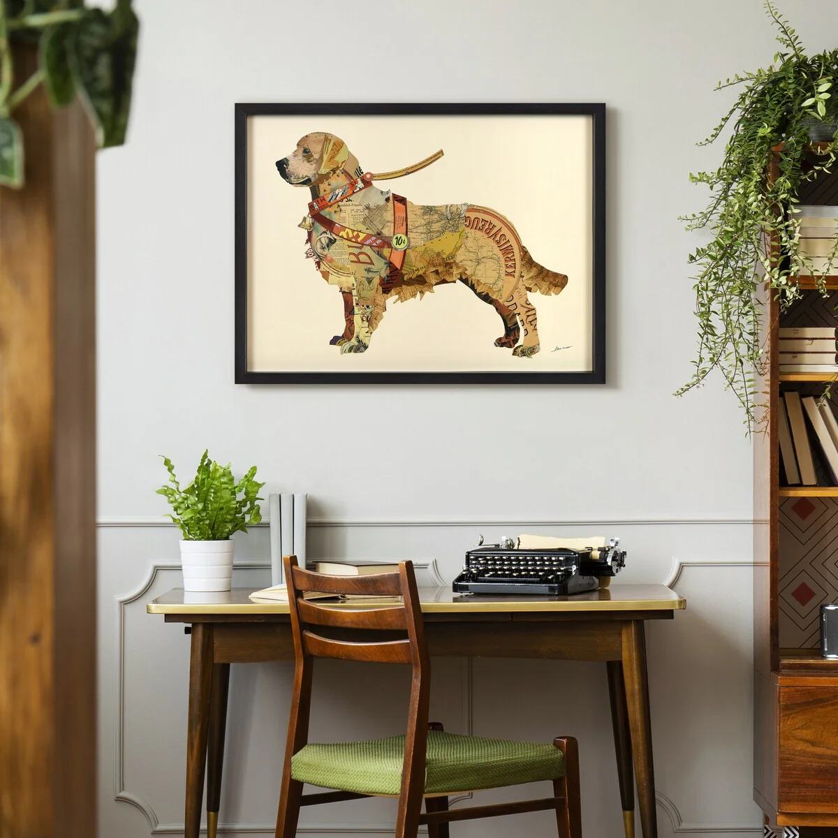 "Golden Retriever" Hand-made Dimensional Wall Art Collage, under glass, encased on a black shadow box frame